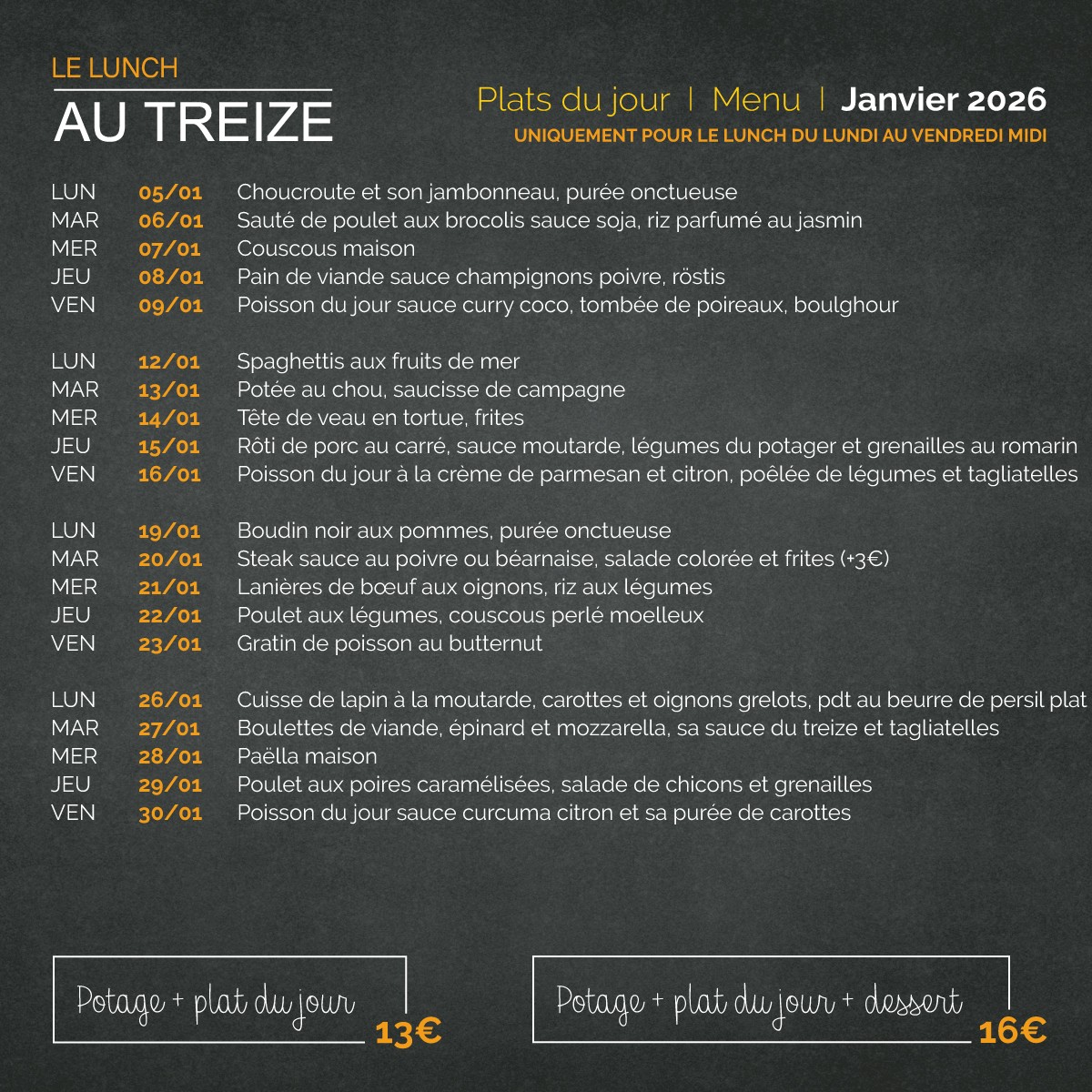 Service du midi (Tous les jours en semaine). Profitez de notre service Lunch avec un plat du jour concocté avec soin, une carte brasserie variée, ainsi que des sandwichs et salades.