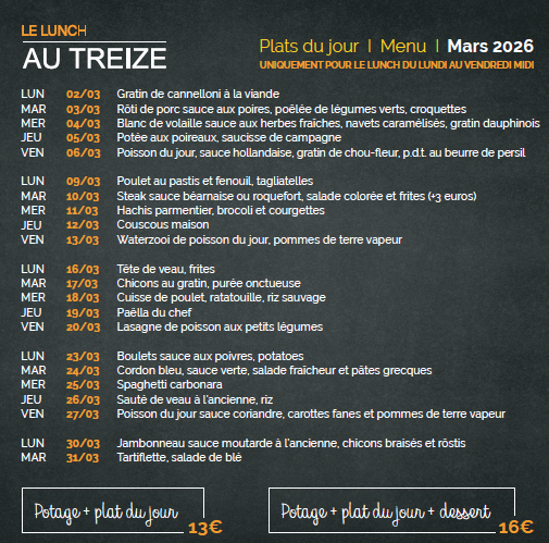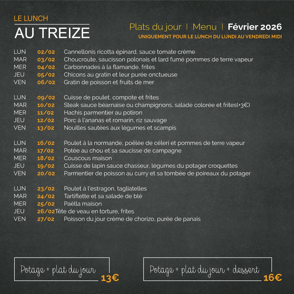 Service du midi (Tous les jours en semaine). Profitez de notre service Lunch avec un plat du jour concocté avec soin, une carte brasserie variée, ainsi que des sandwichs et salades.